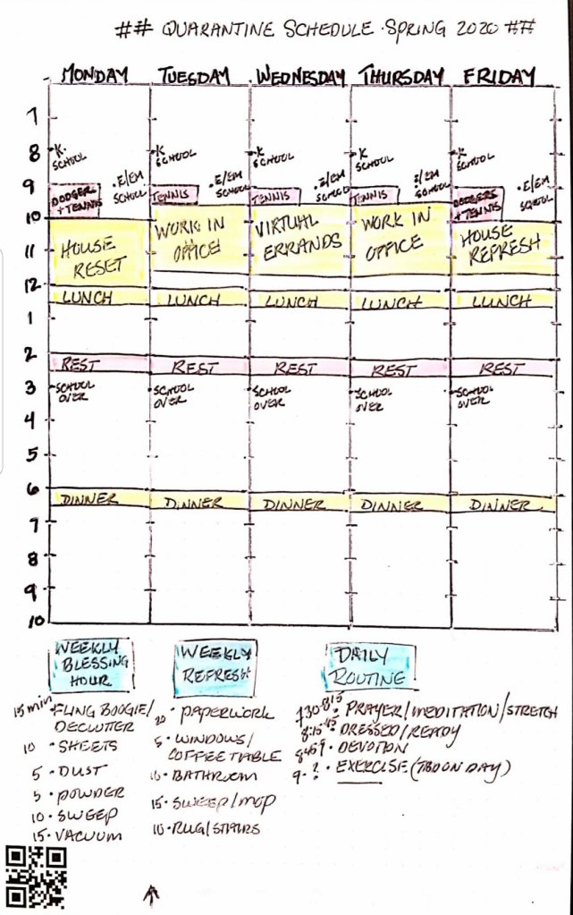 Afternoons: Right now unstructured time in the afternoon and evening allows for the uncertainty of quarantine, including helping kids with schoolwork, getting outside for a health break or exercise, dealing with emotional issues, discussions with my husband, connecting with family and friends, spending time together as a family, etc…and completing any unfinished work