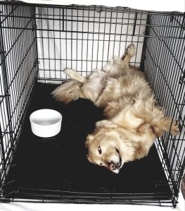 Laughing at the Dog. Our dog is very, very, high energy and extremely needy for attention. Sometimes this can be quite draining, especially with all of us at home these days. But walking by her kennel yesterday, I discovered her totally chill position (see picture at right). I had to laugh at our silly dog.