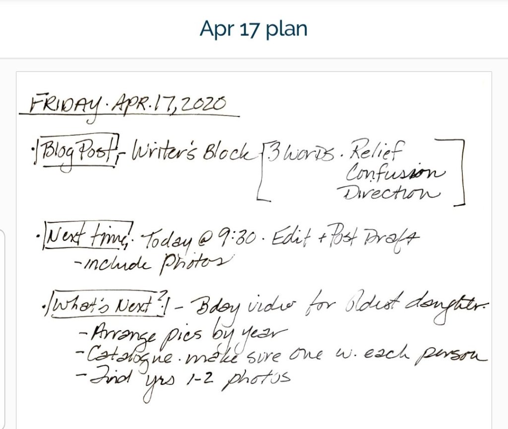 Bullet One: Jot down in three words how the task/project went. This is very important and is what helps you stay motivated to keep going. Writing coach Cynthia Morris teaches all her students to write three (3) words about their experience after they’ve finished writing. This can be what the person feels or what s/he has learned. My three words (picture above) for this blog post are re (lief, confusion, and direction. After starting on this post, I feel both a sense of relief for finally putting a few words to paper and direction for what I need to do next. I also feel somewhat confused because I had to stop in the middle of this post and thoughts are swimming in my head.